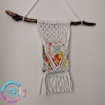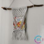 Decorative hanger for walls, useful to hold books or magazines, made with macrame techniques.