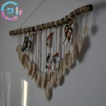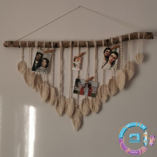Decorative object for walls, photo hanger, with macrame leafs and wooden beads. It's a perfect way to display your special memories.