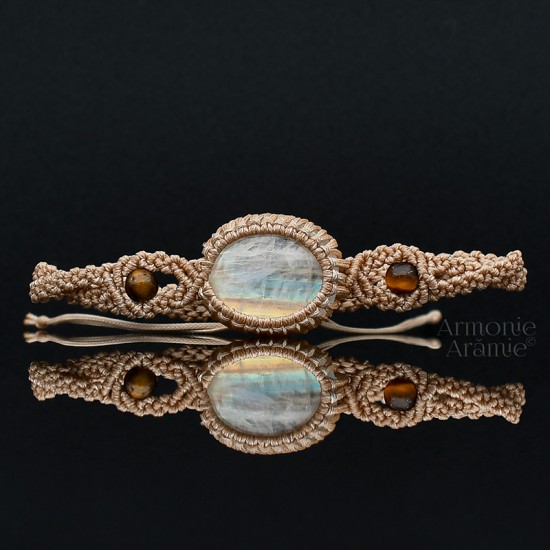 Labradorit alb (piatra lunii curcubeu este numele comercial) și ochi de tigru înfășurate în ață cerată.