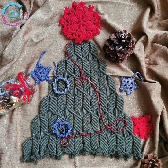 Obiect decorativ pentru perete, realizat prin tehnica macrame, perfect pentru a înlocui bradul clasic de Crăciun.